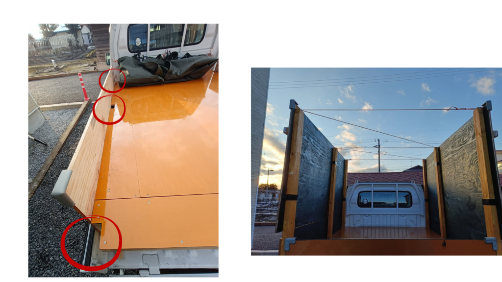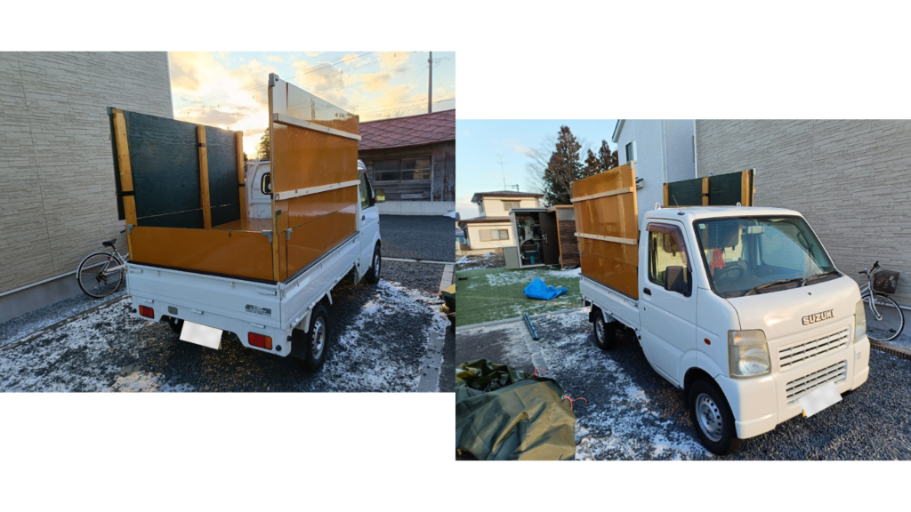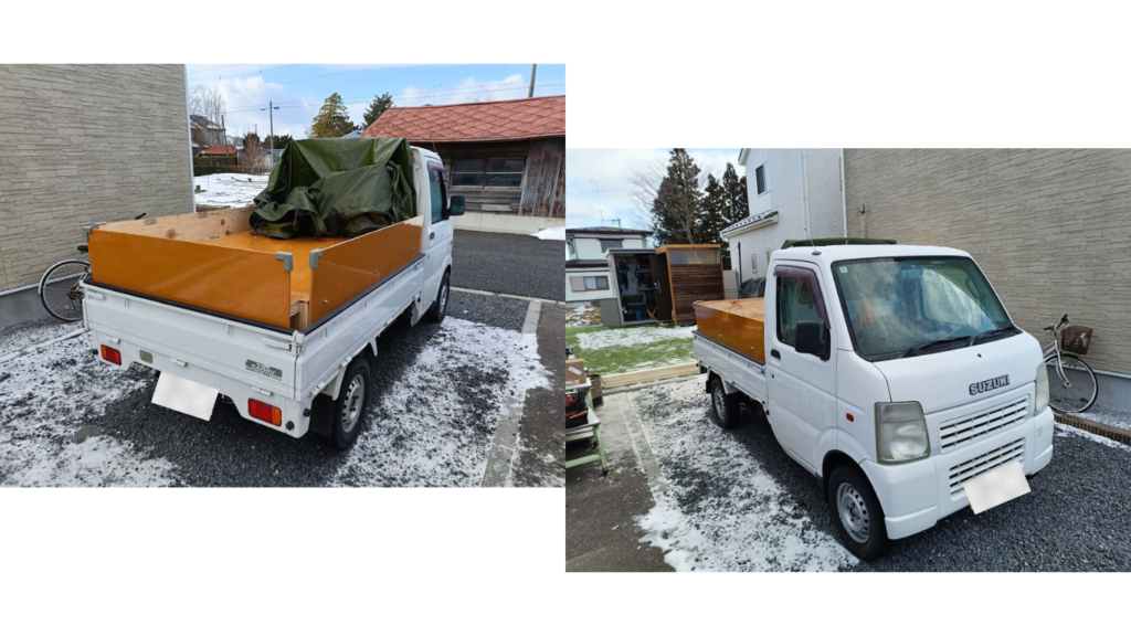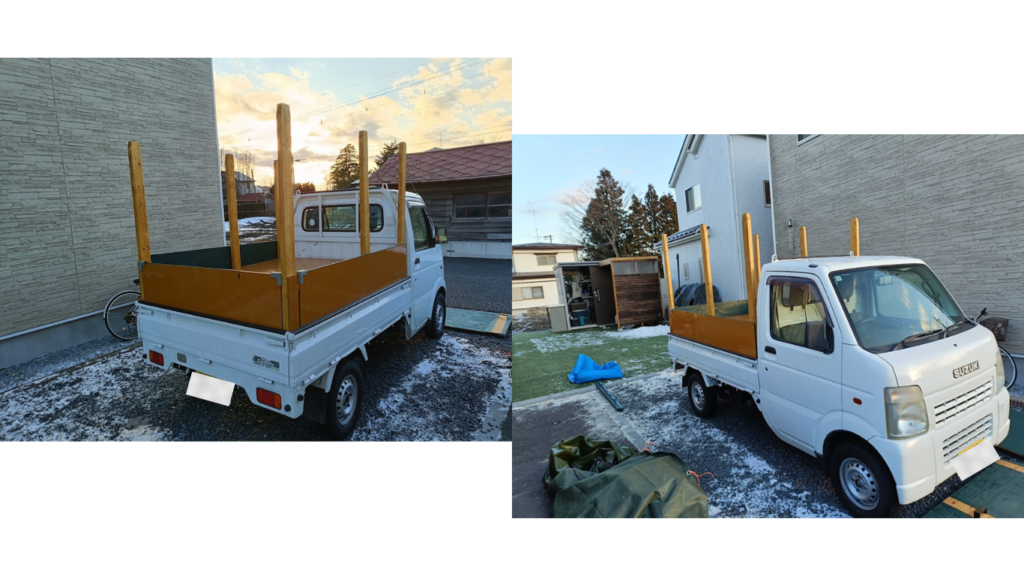 また、あおりが低いので多くの草木や道具を積み込むことができないため荷台のカスタムを行いました。